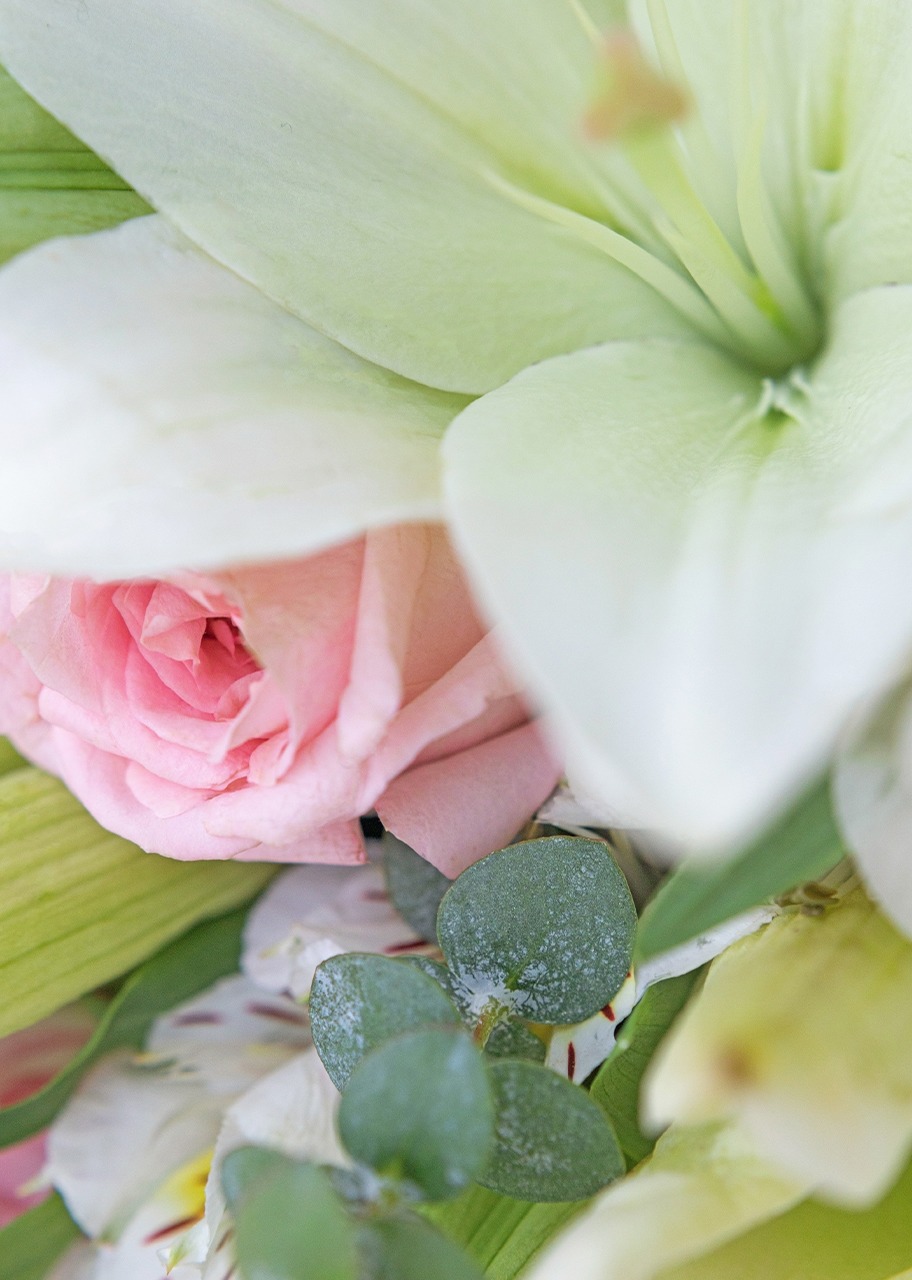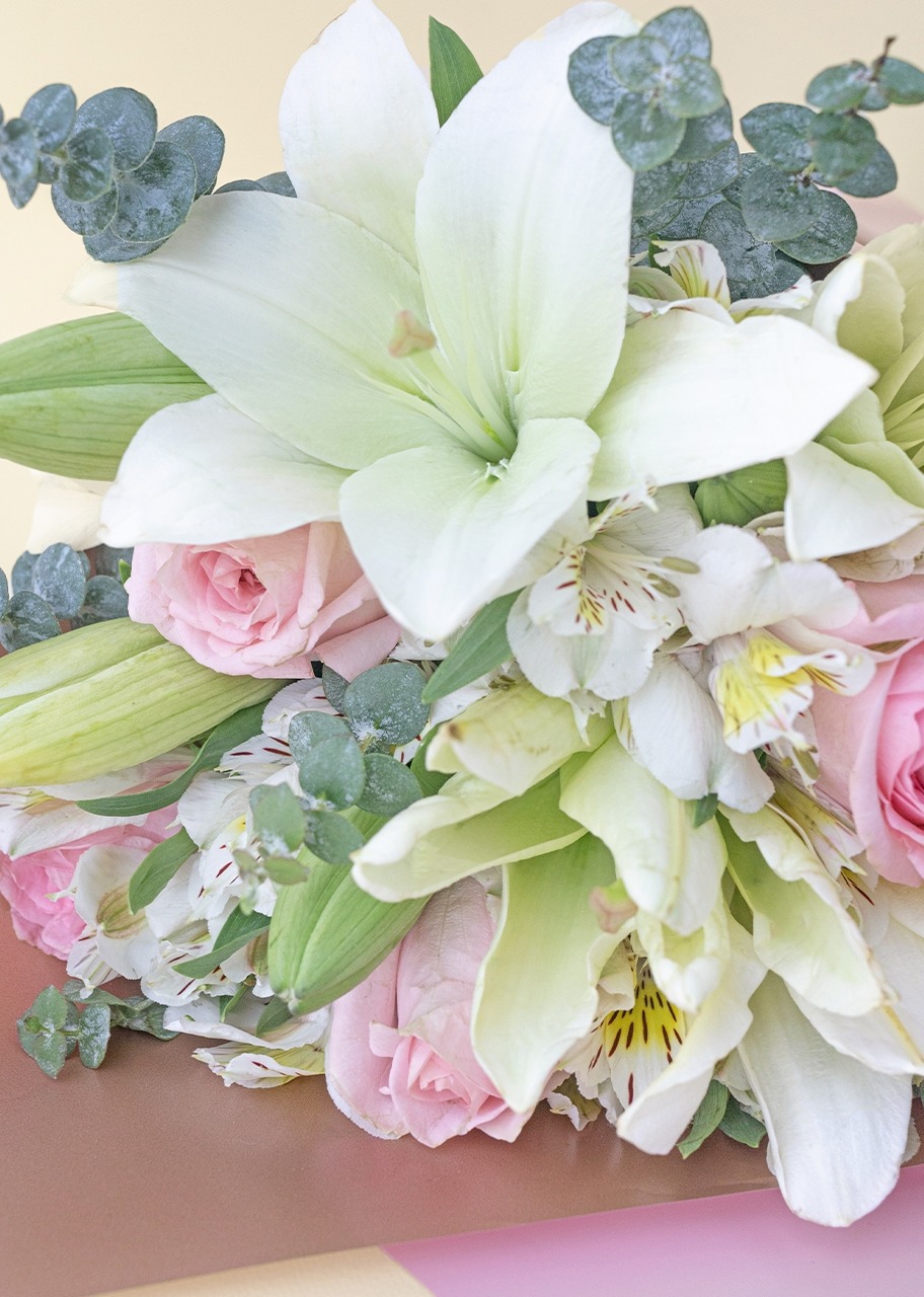 Regala este ramo con 4 rosas rosas, lilys blancas y alstroemerias,