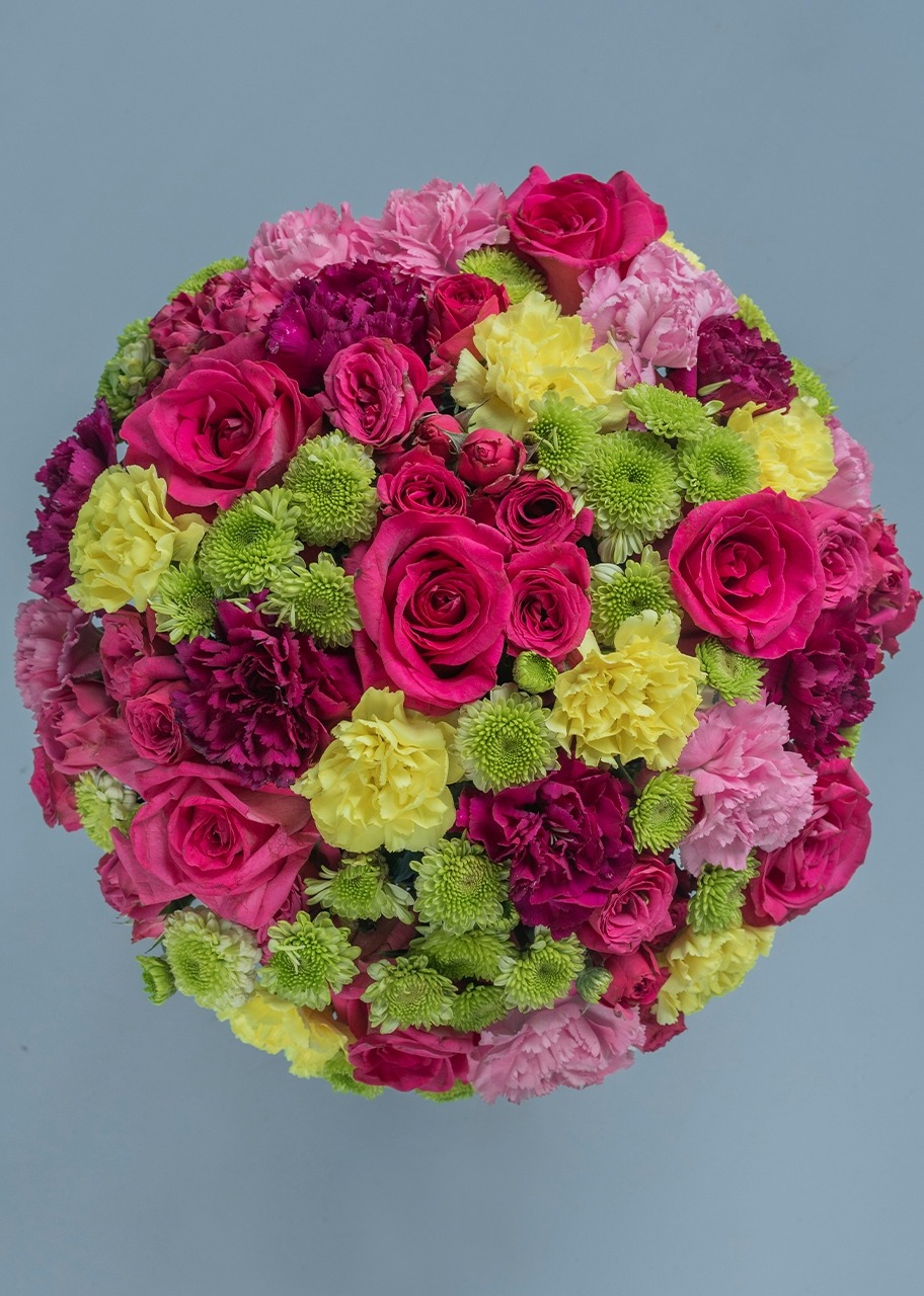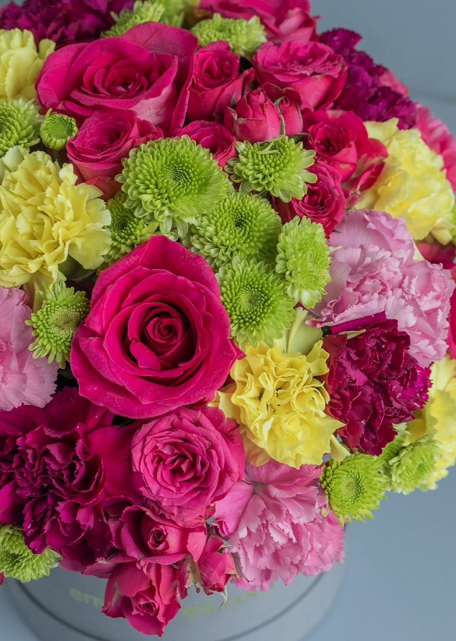 Este hermoso arreglo incluye 7 rosas fiusha, mini rosa fiusha, clavel amarillo, rosa claro y morado y margarita verde en caja gris.